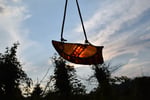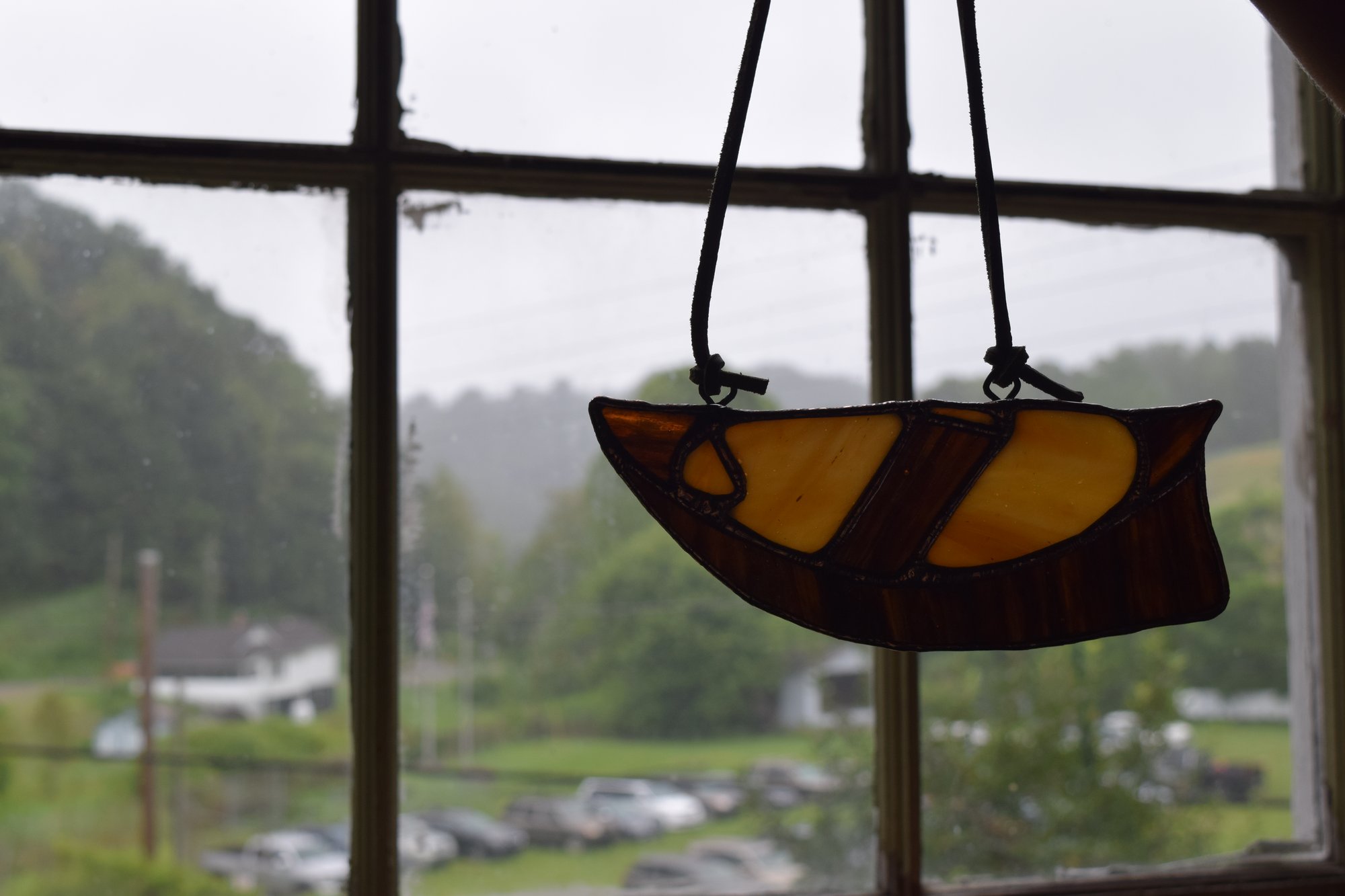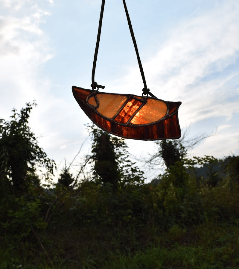 Stained glass piece via the Tiffany method with a copper patina finish. Size about 7" by 4".